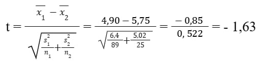 Рассчитанное t: - 1,63. Степени свободы: df ≈ 42,76.