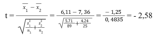 Рассчитанное t: - 2,58. Степени свободы: df ≈ 43,9.