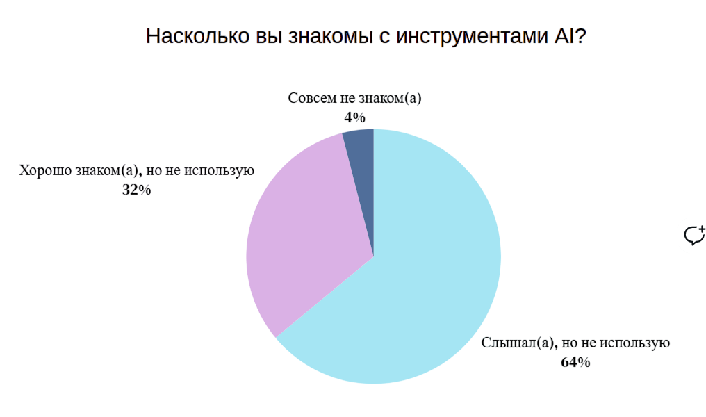 При этом лишь 4% вообще не знакомы с технологиями AI, а 64% респондентов всё же имеют поверхностное представление (“слышал, но не применяю”), и 32% хорошо осведомлены о функциях и возможностях AI , но целенаправленно по своему решению избегают его использования.