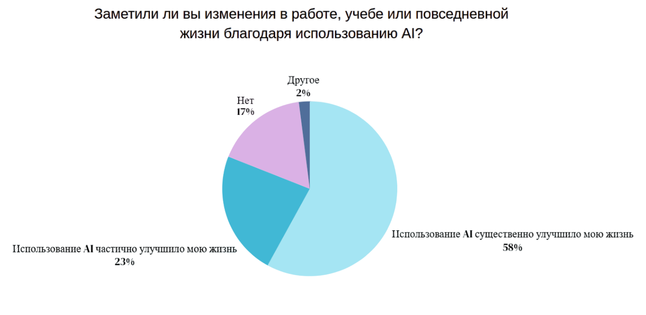 Субъективная оценка изменения жизни из-за влияния AI: 58% отметили существенное улучшение уровня жизни, 23% частичное, 17% не зафиксировали заметных изменений. В сценарии гипотетического исчезновения AI 54% респондента ожидают ухудшения качества жизни, 27% не видят существенных последствий, 5% затруднились с ответом.