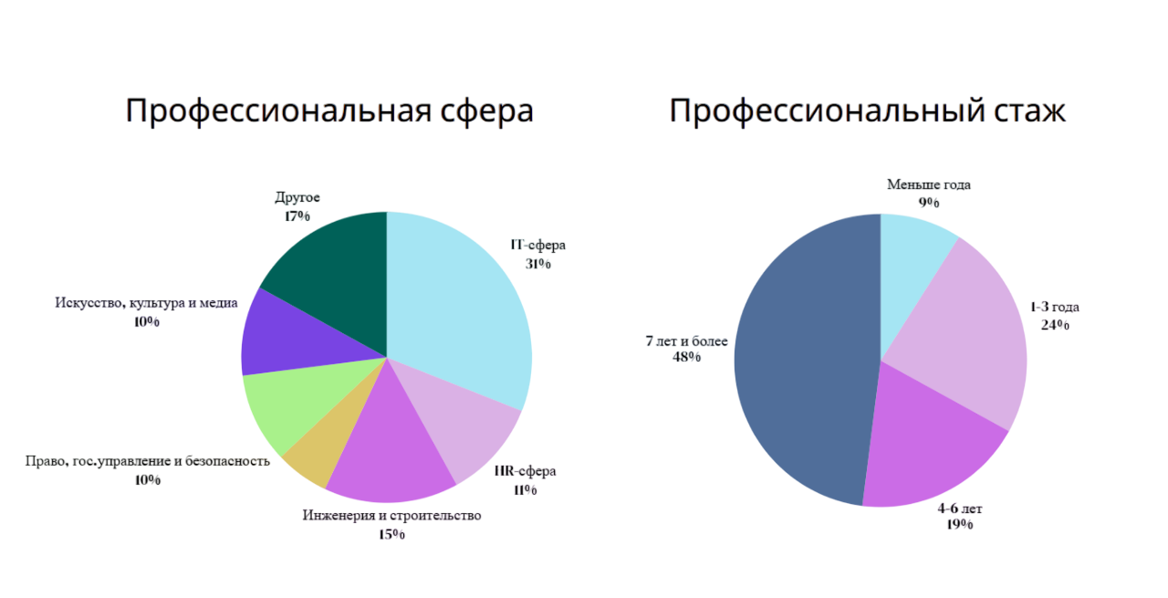 Профессиональный стаж респондентов: 48% работают в своей сфере семь лет и более, еще 19% от четырех до шести лет. Специалисты с опытом один-три года составили 24%, начинающие 9%. Отраслевое распределение респондентов также оказалось разнообразным. Наиболее частыми сферами респондентов стали IT (31%), инженерия и строительство (15%), HR (11%), государственное управление, право и безопасность (10%), а также направления, связанные с культурой, медиа и творческими индустриями (10%). Остальные профессии объединены в категорию «другое» (17%).