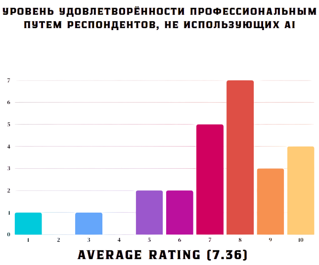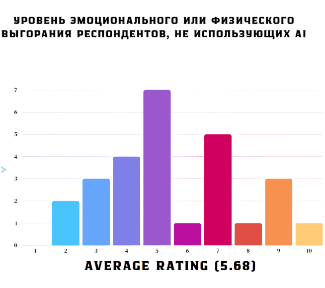 Средний показатель уровня выгорания у респондентов, не использующих AI, составил 5,68 (по шкале от 1 до 10, где 10 - максимальный уровень выгорания). Средний показатель уровня удовлетворения профессиональным путем у респондентов, не использующих AI, составил 7,36 (по шкале от 1 до 10, где 10 - максимальный уровень удовлетворения своим профессиональным путем).