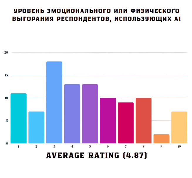 Средний показатель уровня выгорания у респондентов, использующих AI, составил 4,87 (по шкале от 1 до 10, где 10 - максимальный уровень выгорания). Также средний показатель уровня удовлетворения профессиональным путем у респондентов, использующих AI, составил 6,08 (по шкале от 1 до 10, где 10 - максимальный уровень удовлетворения своим профессиональным путем)